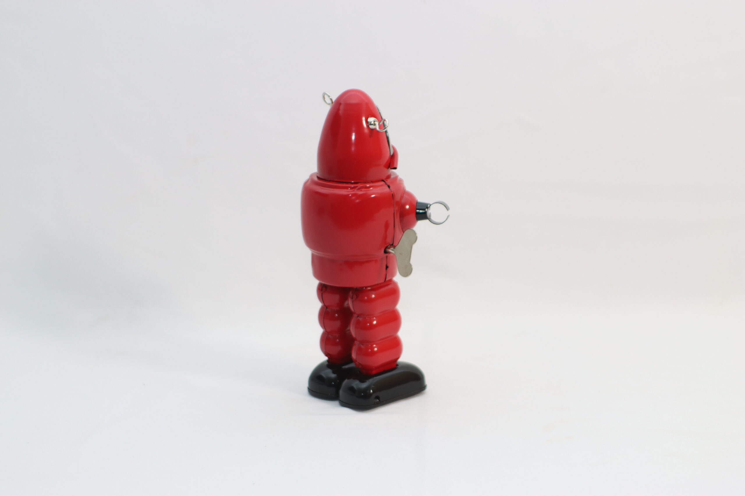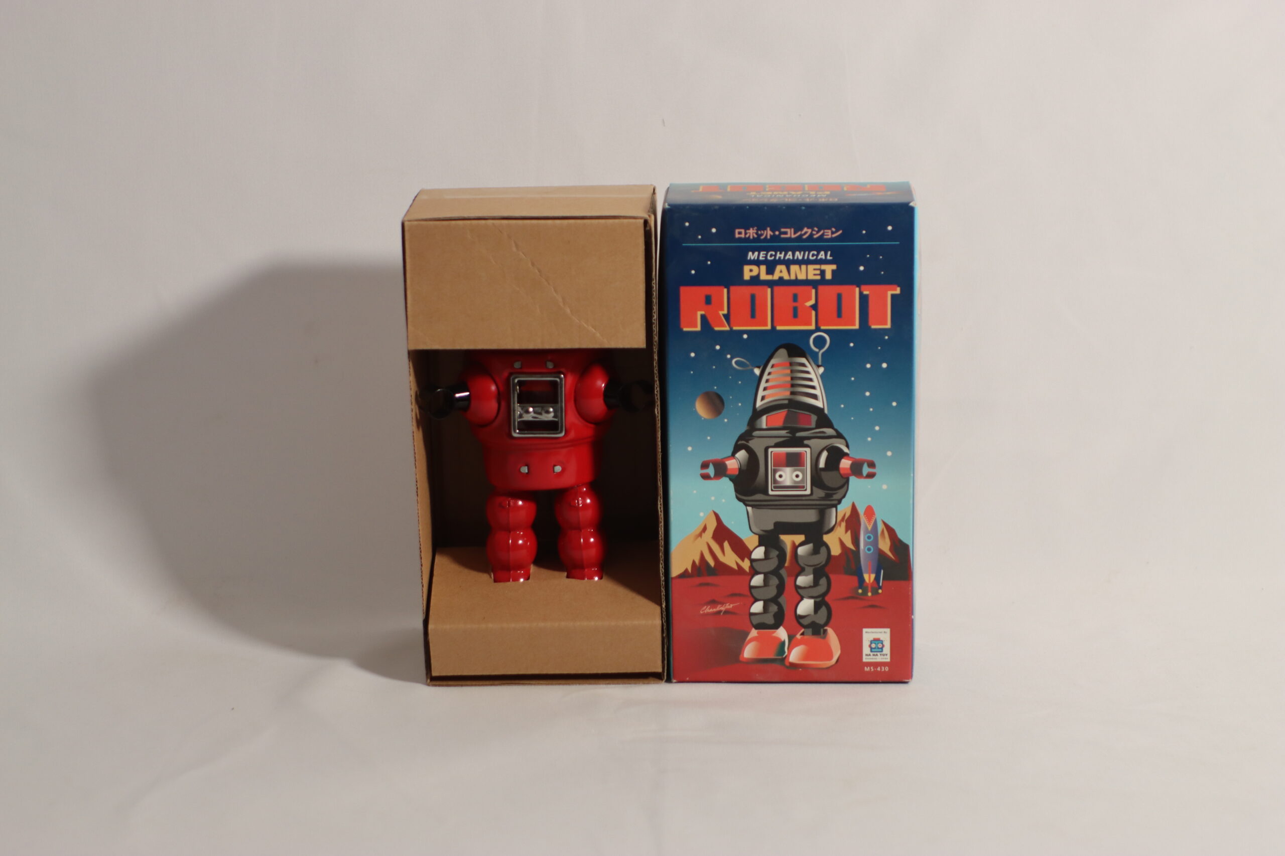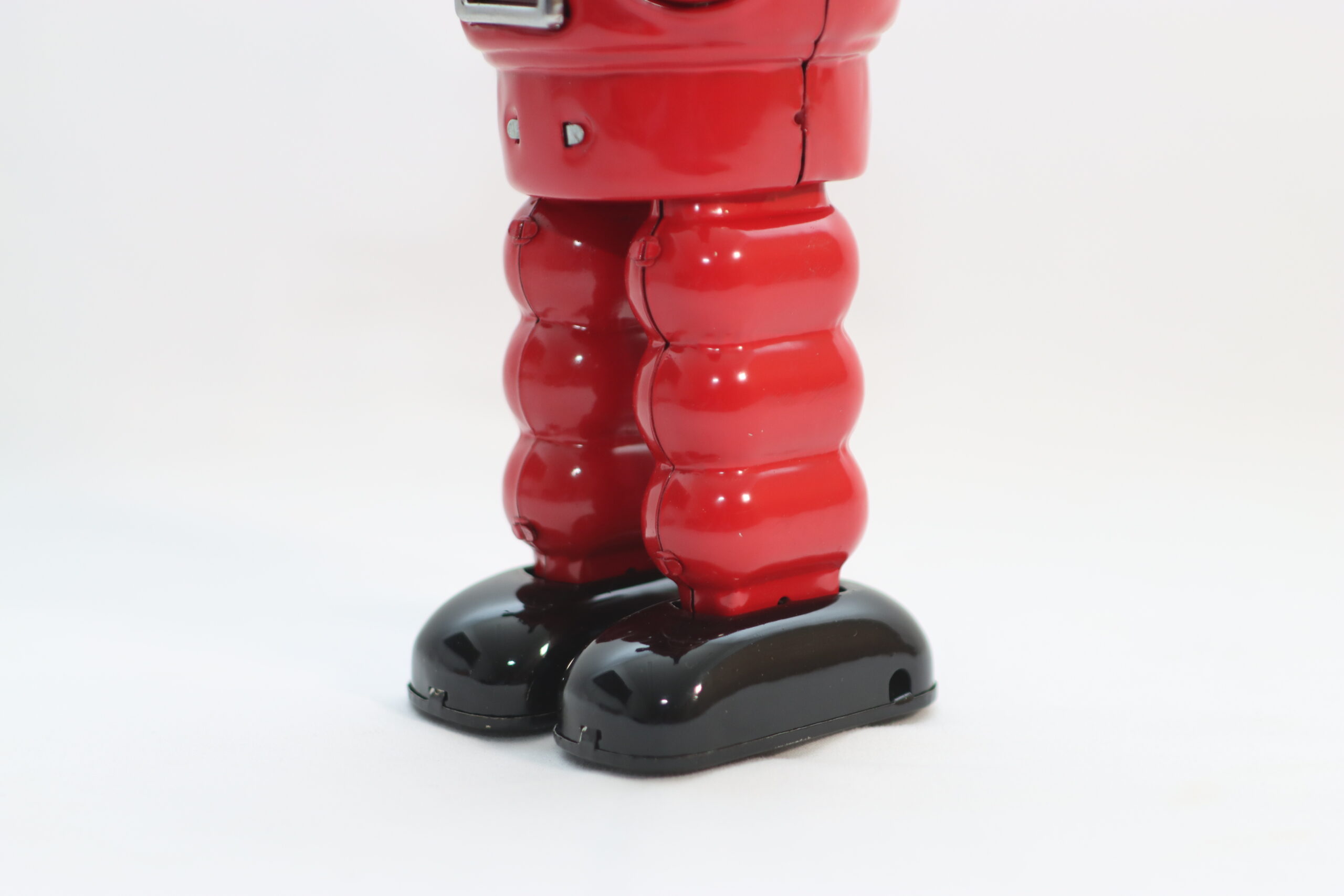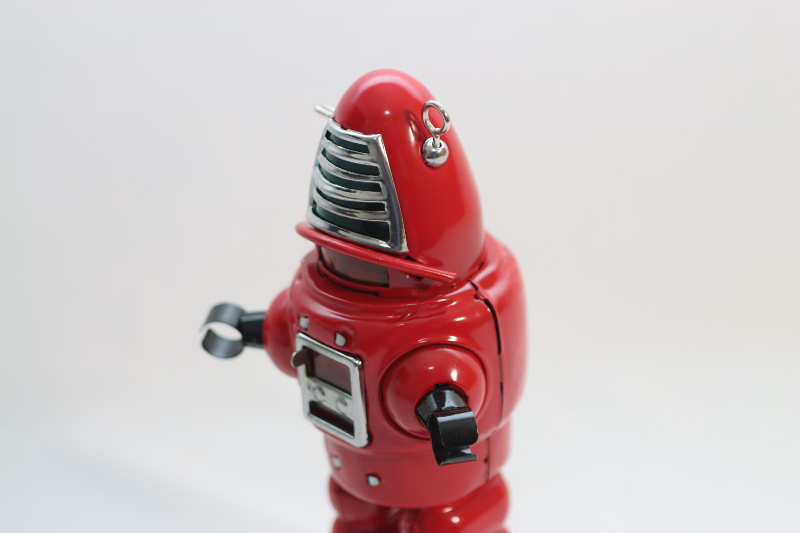 「SFの黎明期を象徴する、クラシックなデザインのブリキ製『プラネット・ロボット』です。 鮮やかなグロスレッドのボディと、どこか人間味のある独特なフォルムは、一目で人々の視線を引きつける圧倒的なキャッチーさを持っています。