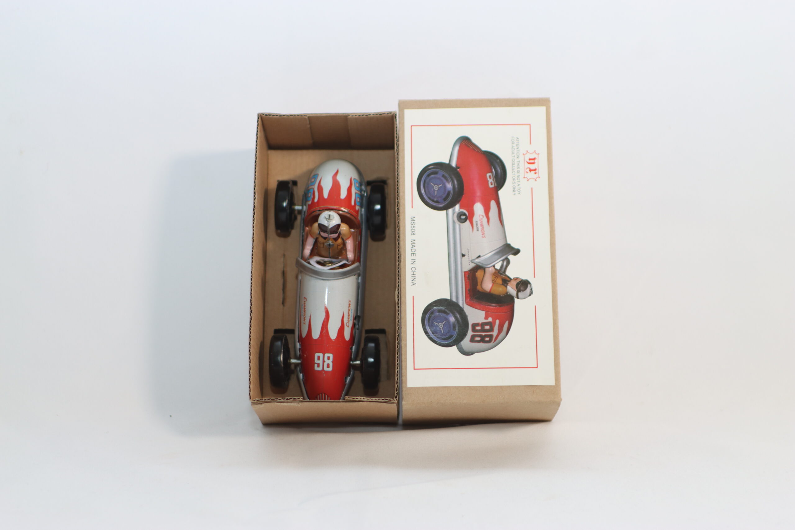 「古き良きモータースポーツの黄金時代を彷彿とさせる、流線型のブリキ製レーシングカーです。 ゼッケン『98』を冠したこのモデルは、白と赤のコントラストが鮮やかなスポーティーな配色が特徴。ドライバーフィギュアが乗り込んだ臨場感あふれる姿は、単なる置物ではなく、その場に**『スピード感』と『挑戦の物語』**をもたらします。