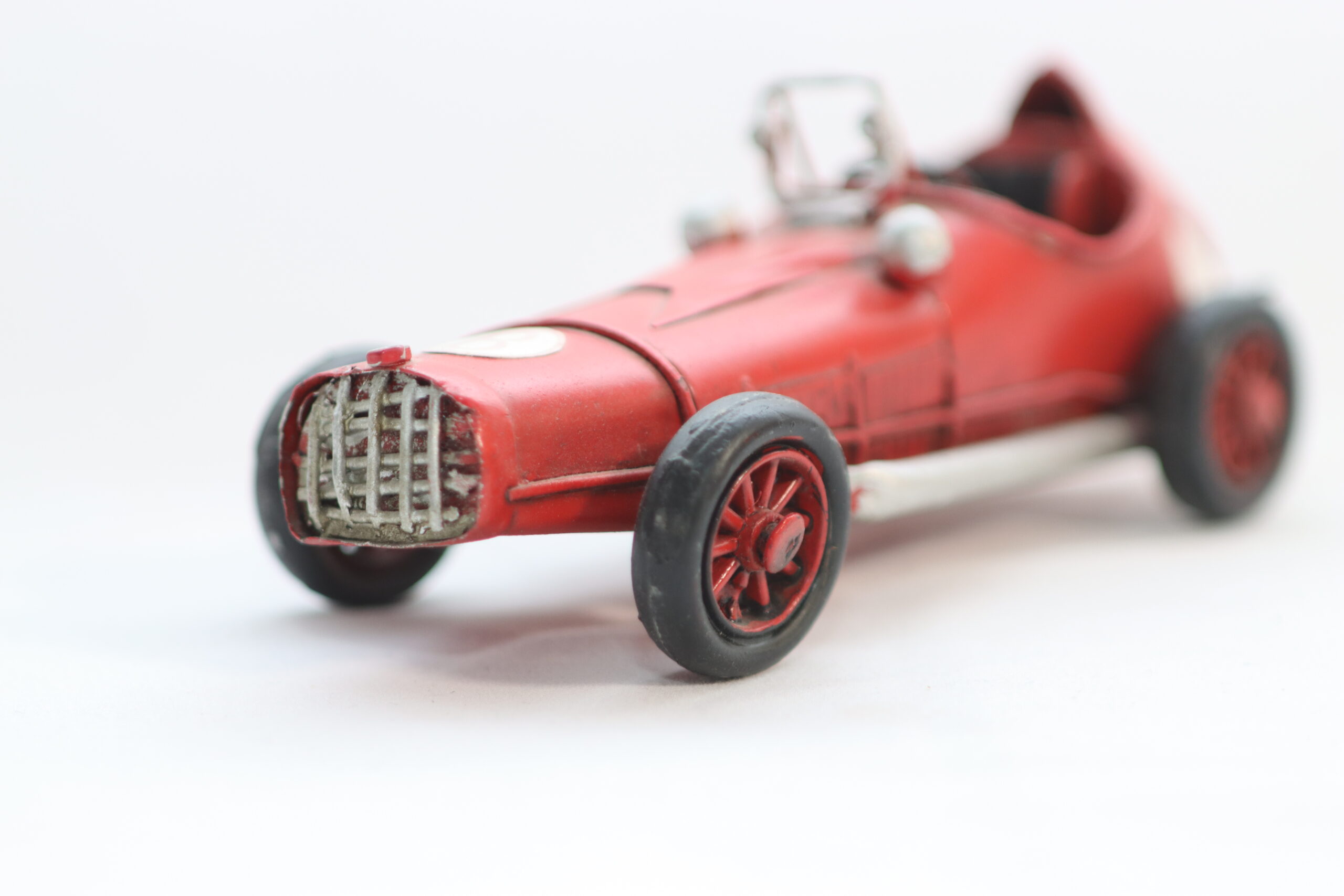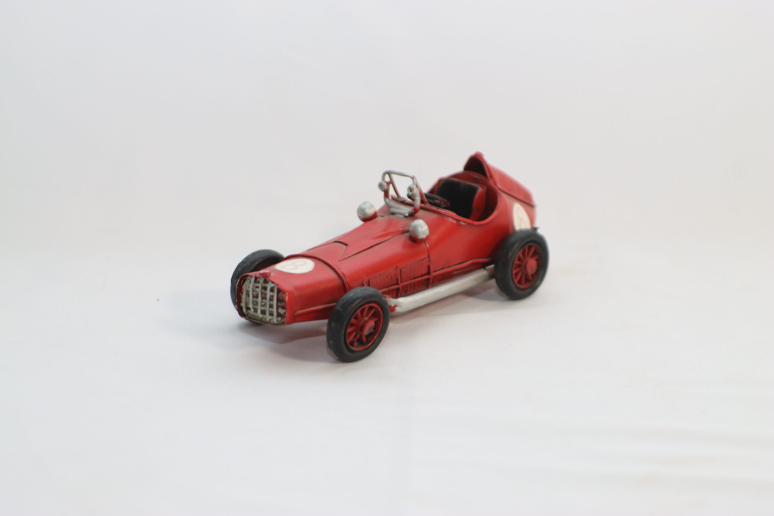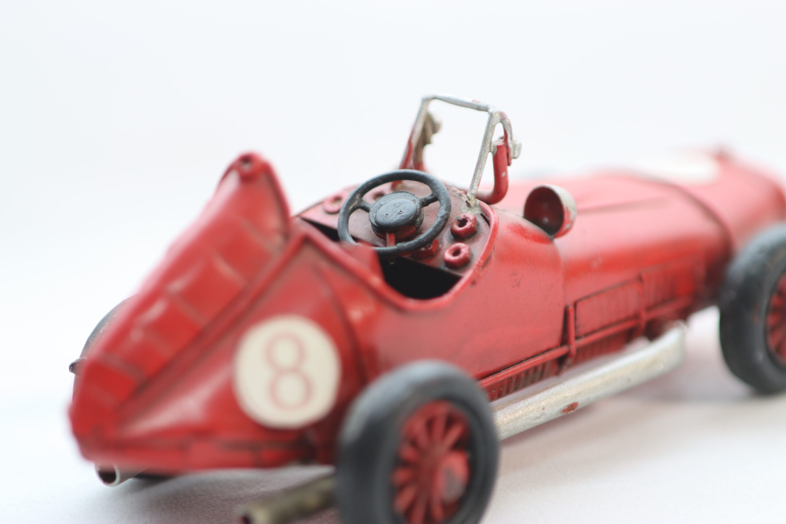 1920〜30年代のグランプリ・レーサーを彷彿とさせる、無骨で力強いブリキカーです。深いレッドは情熱的なスピード感を、マットなブラックは重厚な機能美を体現します。使い込まれた金属の質感が、静止画に力強い物語性を与える、男性的なプロップスの決定版です。