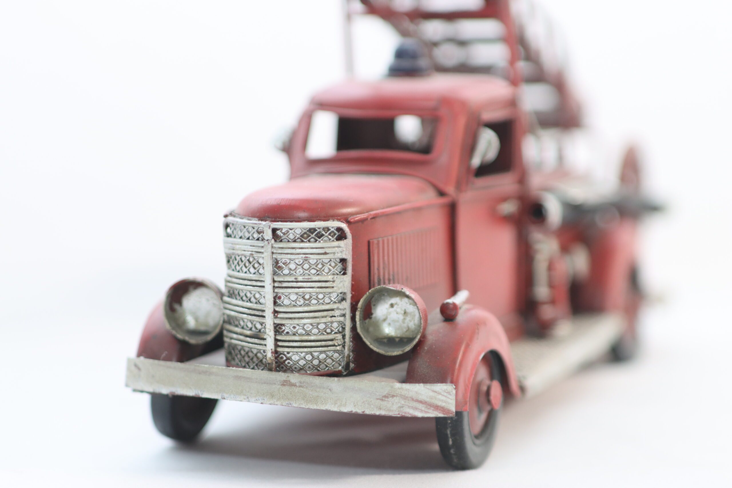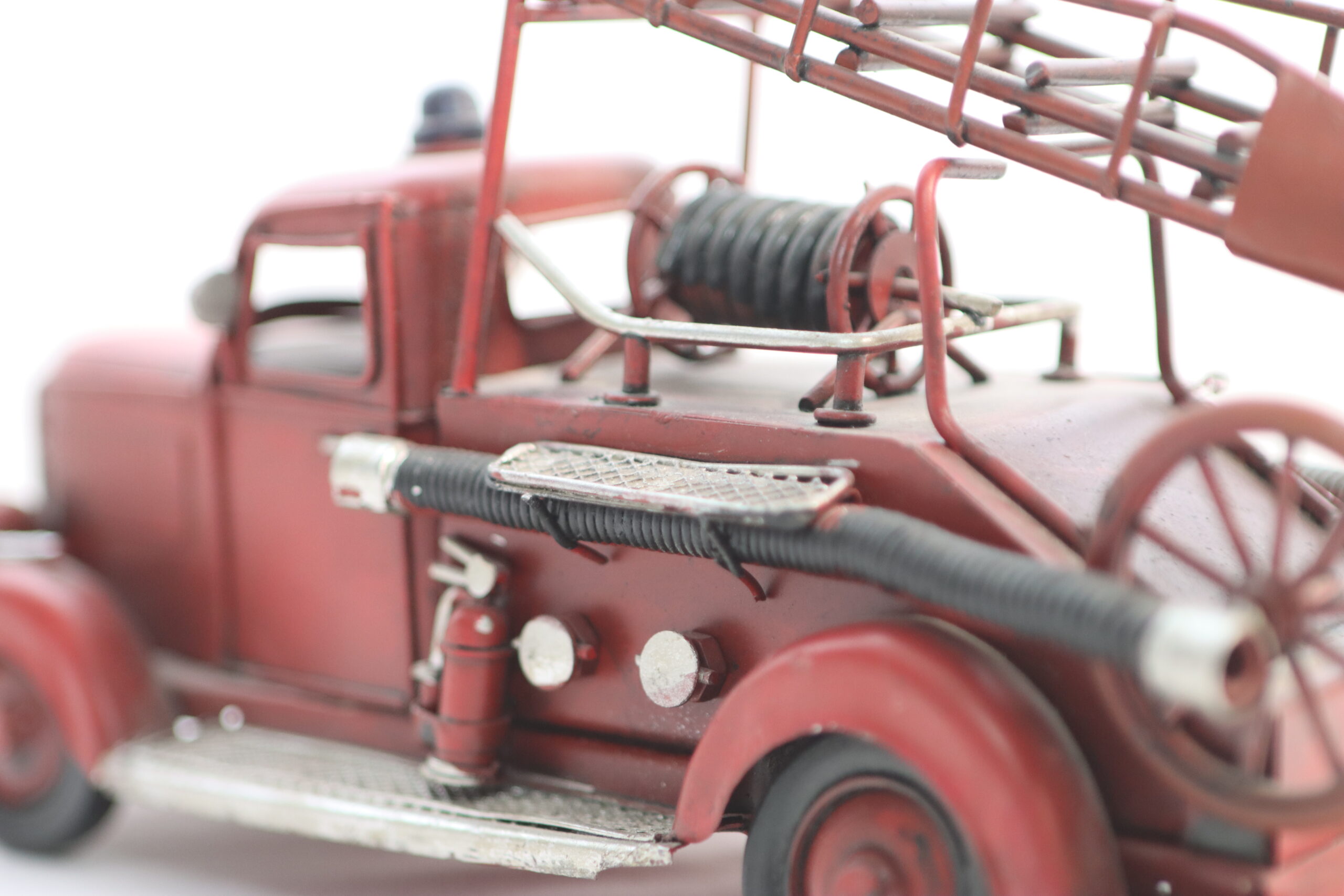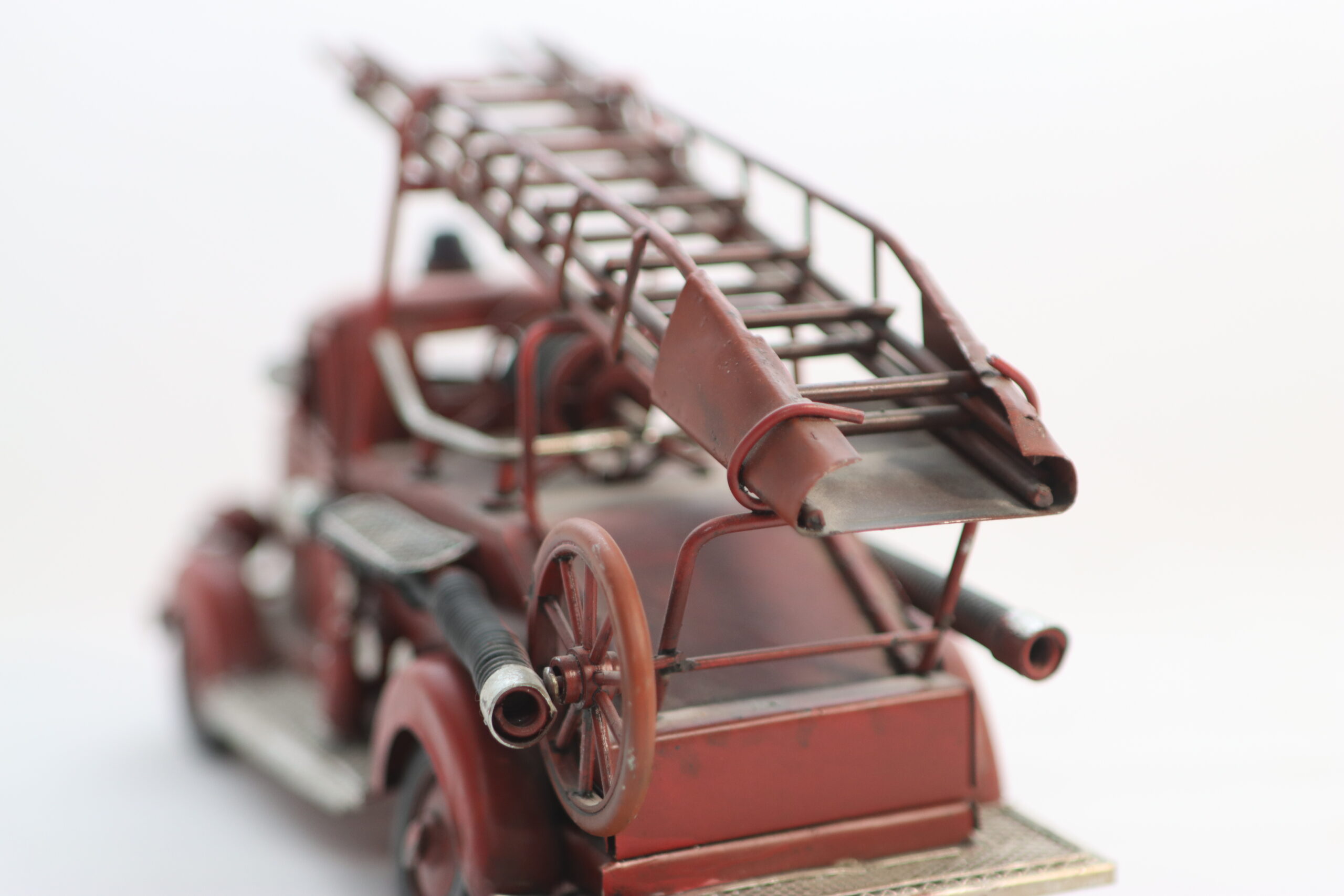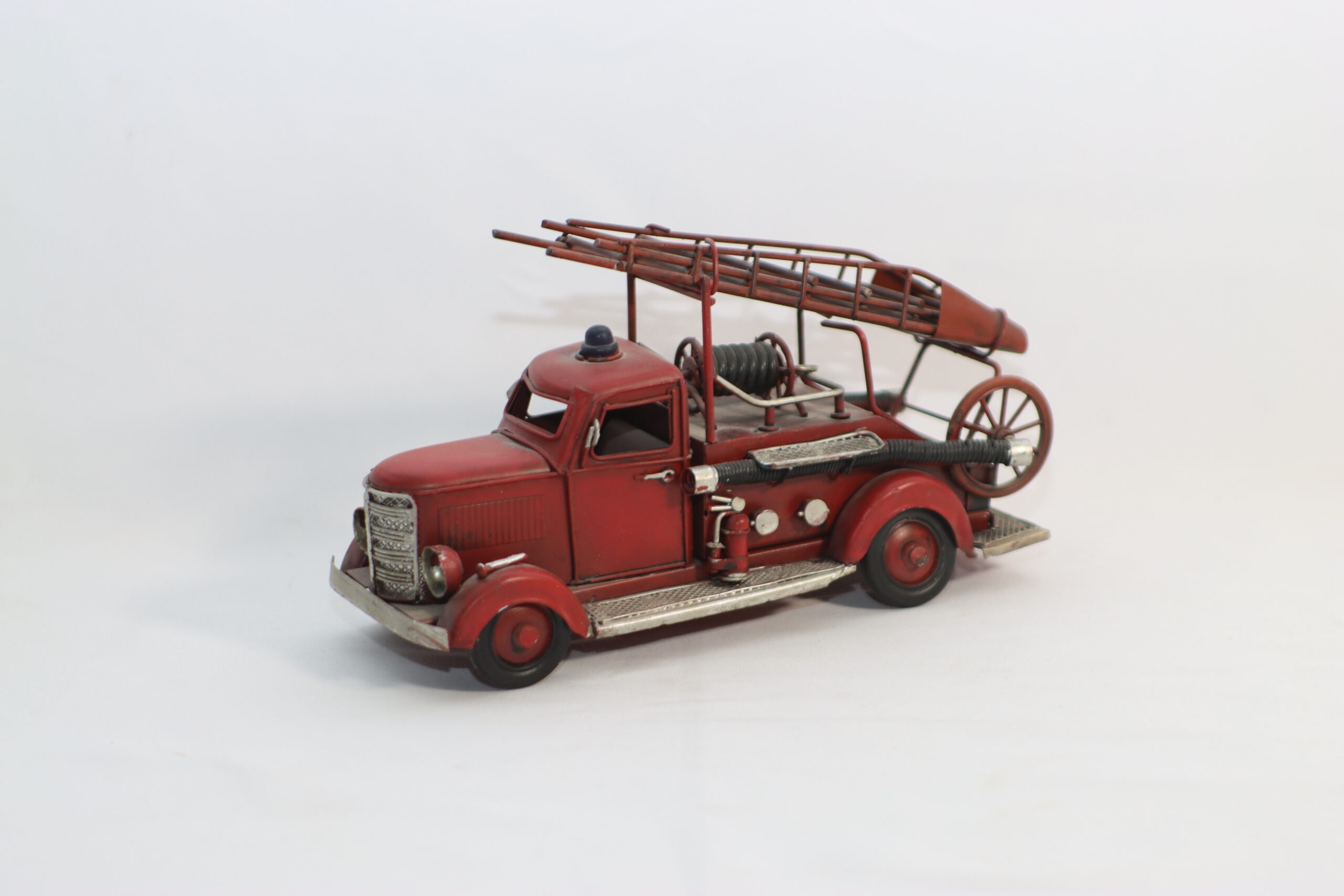 細部まで作り込まれた梯子やホースが、プロフェッショナルな現場の熱気を感じさせるブリキの消防車です. 深みのあるレッドボディとレトロな造形は、見る者に「安心感」と「伝統」を想起させます. 存在感のある大型プロップスとして、インダストリアルな空間や子供向けのノスタルジックなシーンに圧倒的な奥行きを与えます.