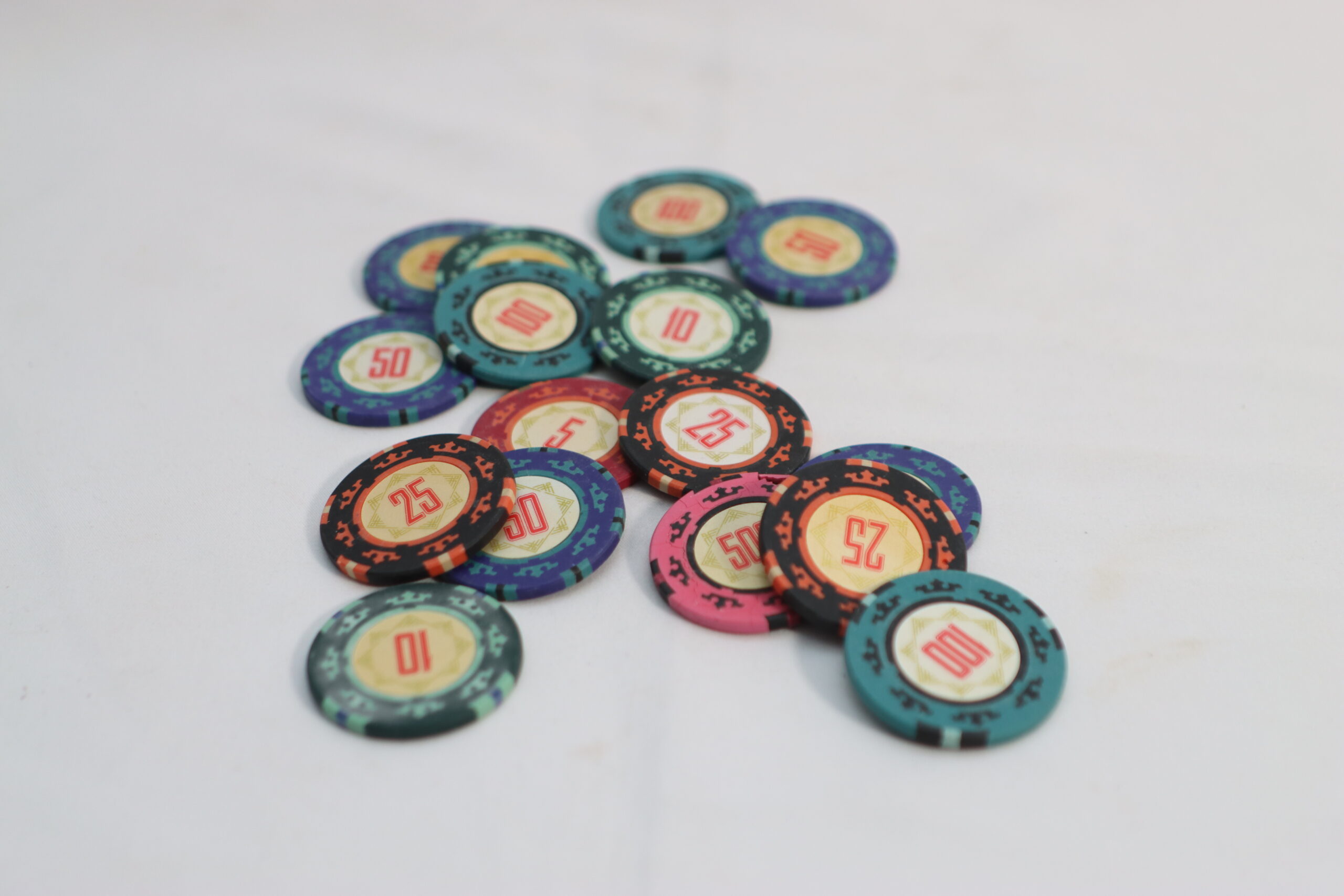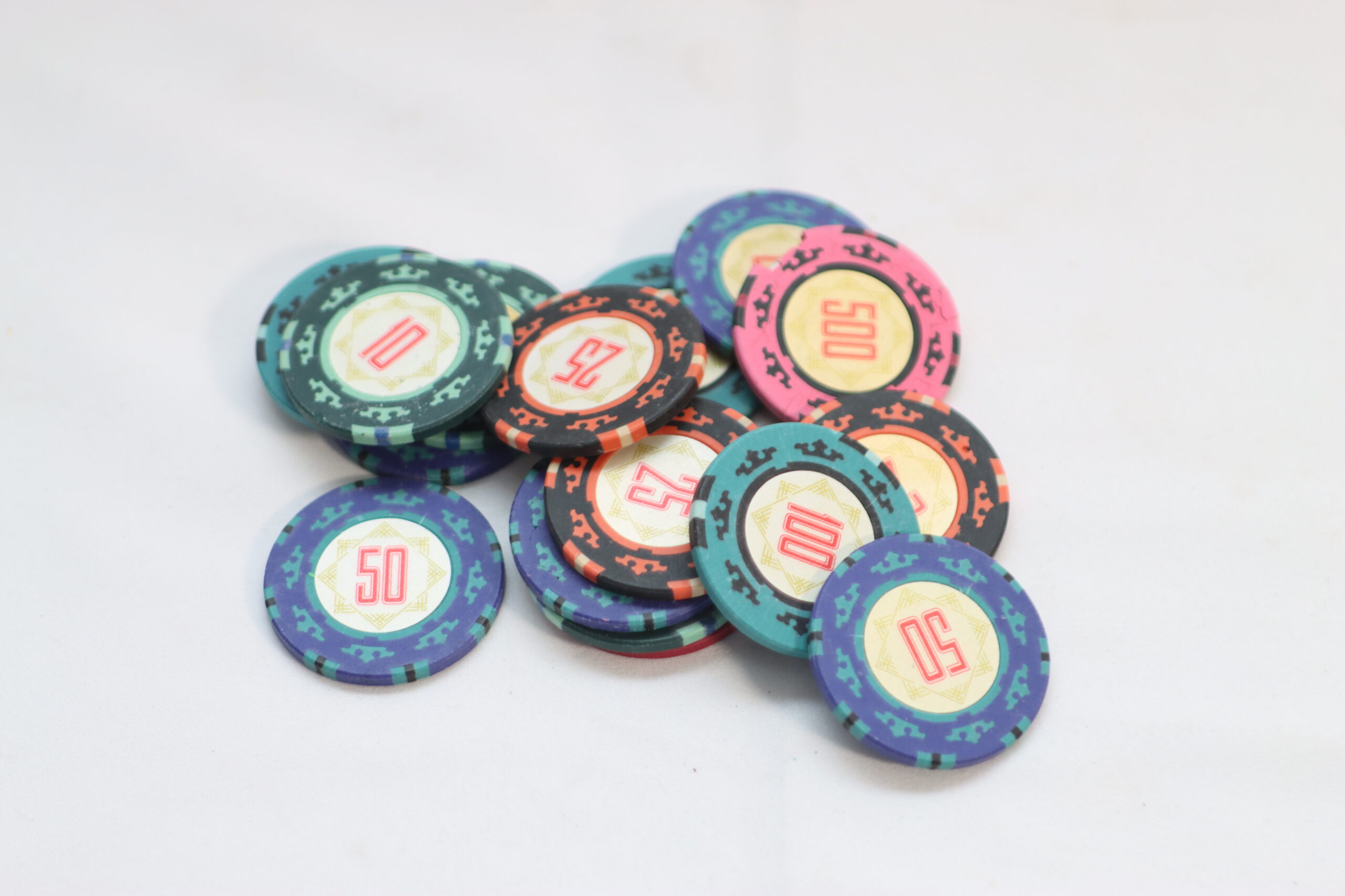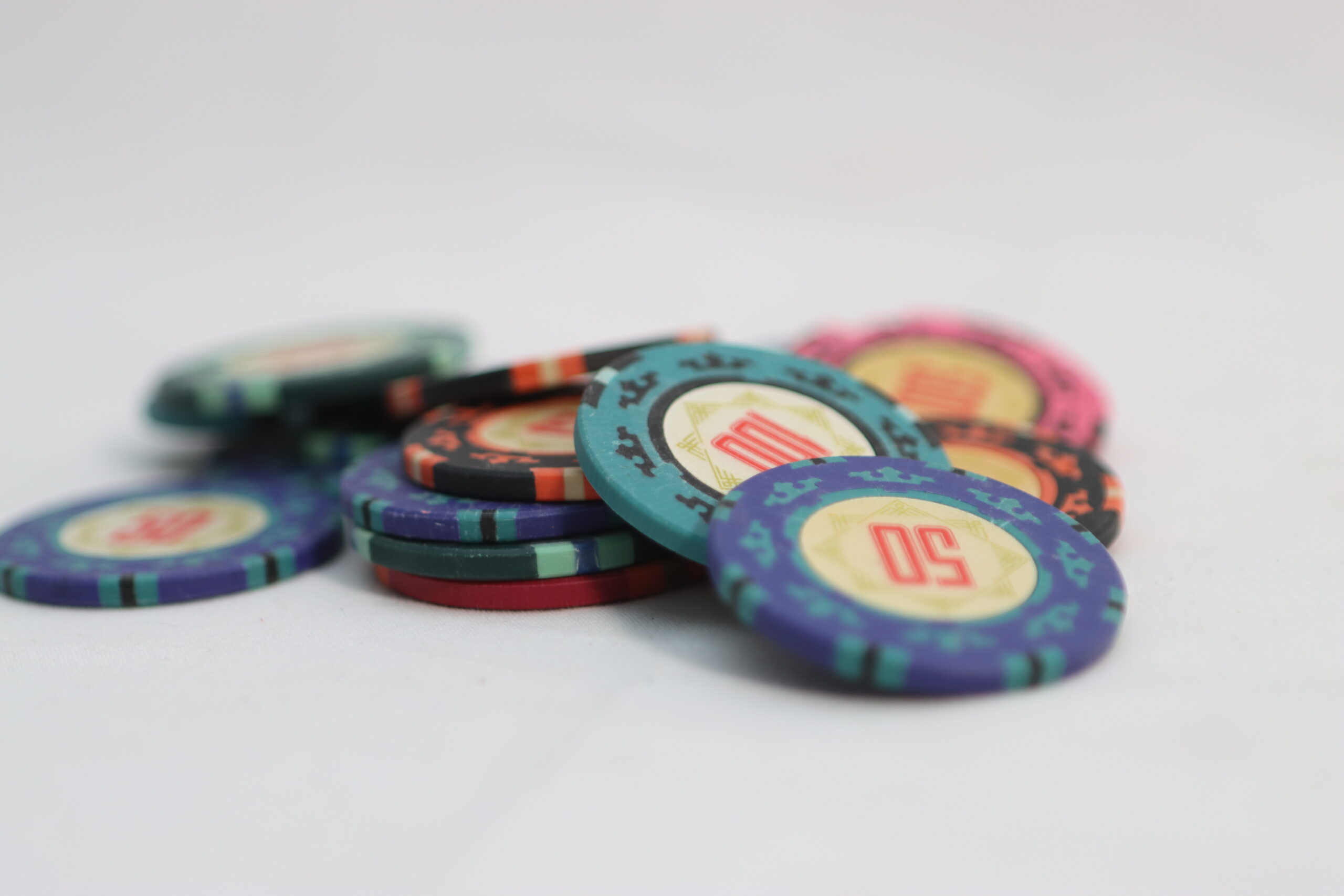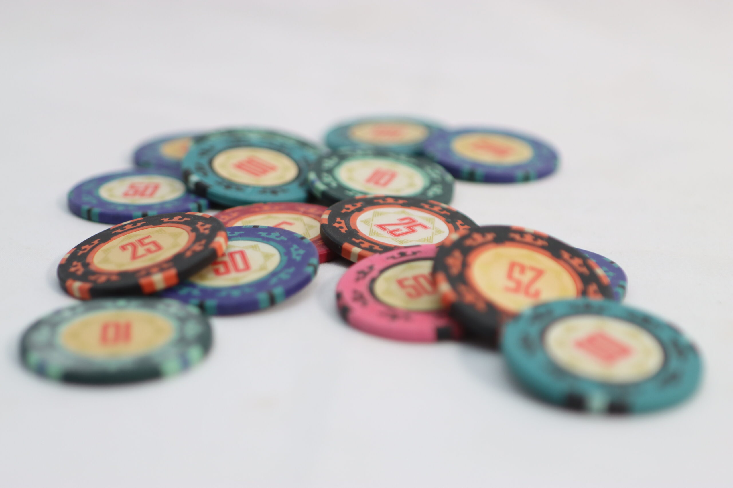 メンズアクセサリーの物撮り: 無造作に積み上げたチップを背景に、高級感と遊び心を両立。