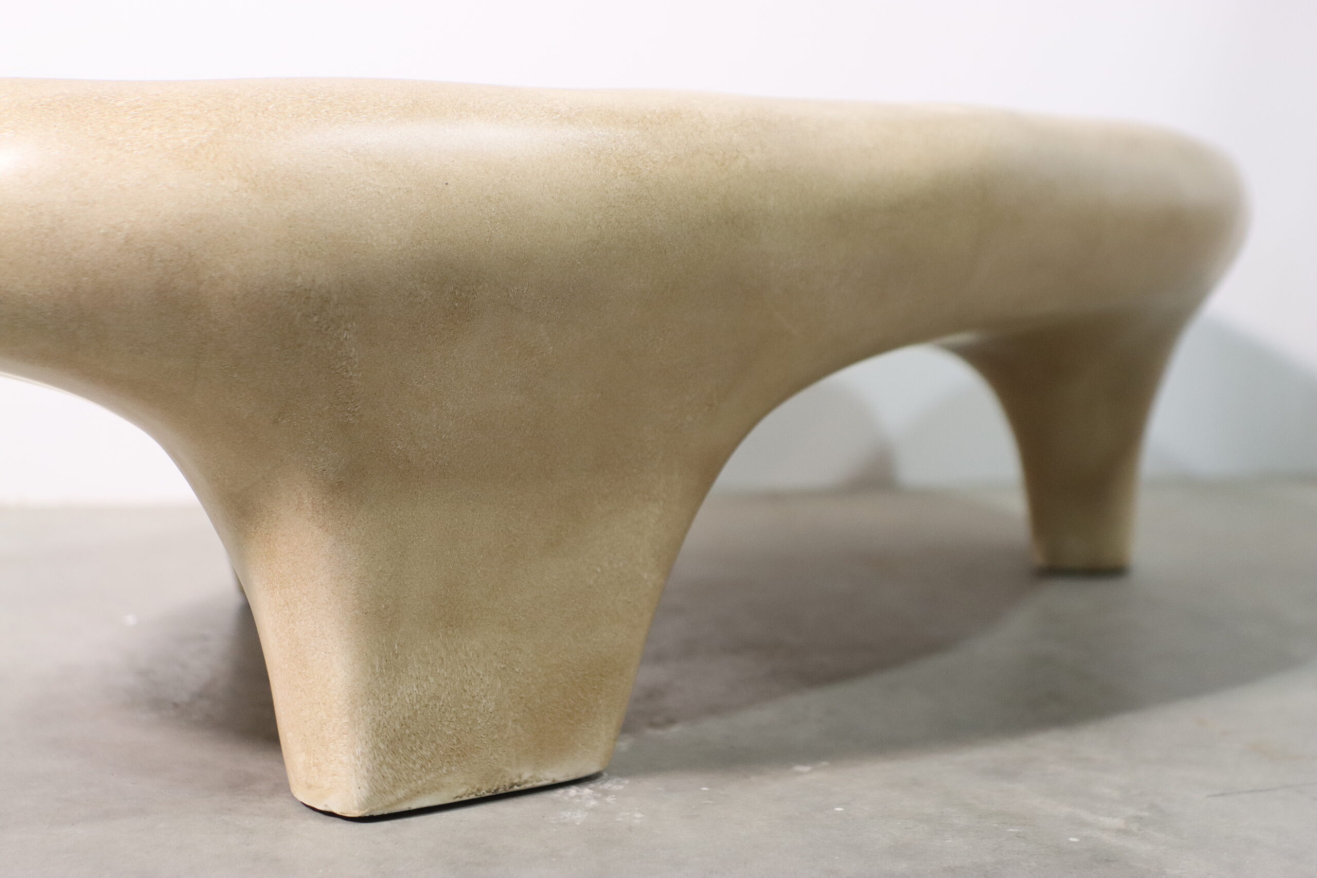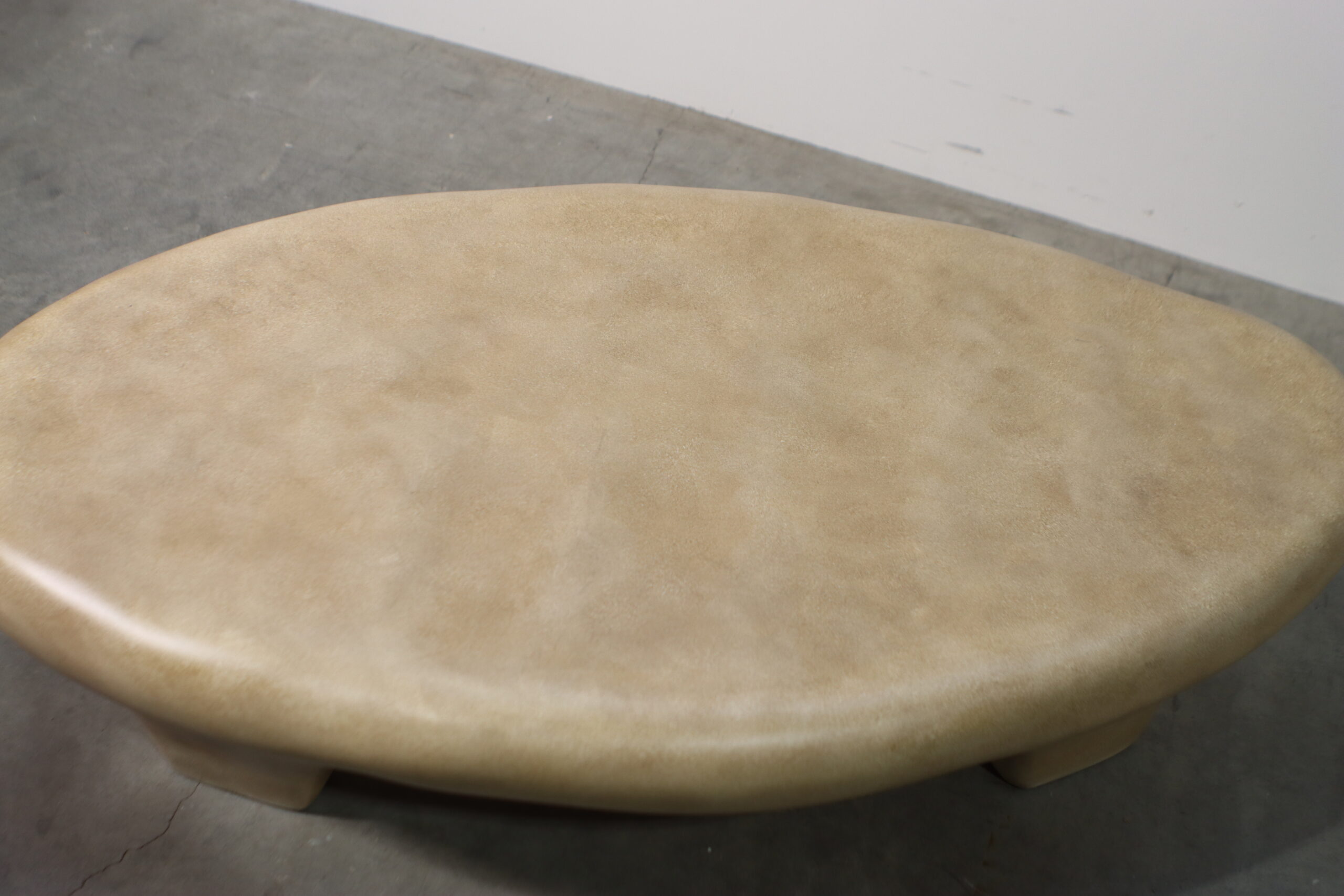 【注意事項】 FRP製でかなりの重量があるため、配置の際は床面の保護や移動時の取り扱いに十分ご留意ください。また、一体成型による独特の風合いには個体差がある場合があり、天板の広さに対して脚部が内側に寄った造形のため、端に強い荷重をかける際の使用には注意が必要です。